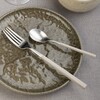 A stylish dessert fork in matte stainless steel with a grey/beige hexagonal handle in SPS. Very light and fits comfortably in the hand. Suitable for both classic and modern table settings.