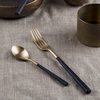 A stylish fork in matte golden stainless steel with a black hexagonal handle in SPS. Very light and fits comfortably in the hand. Suitable for both classic and modern table settings.